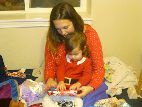 Christmas morning we opened stockings in bed! Favorite tradition! Then came up and opened Mackenzie's presents before family came over. I made apple crisp oatmeal for breakfast with bacon (what is a holiday with out bacon?), we also had "special juice"; which is juice with more that one flavor. My family came over for breakfast and after breakfast we opened more presents. Although Max saw one of her presents before breakfast and loved it!! Her little happy dance is so cute, I must get it on video!! That was her new wagon my parents got her! Mondo and I can't wait to use it!! It also has like ski things to put on to use in the snow. I am going to see if I can track down a canopy for it for summer use! I will post another blog on what our favorite presents were, I don't want to take up to much of your reading time!